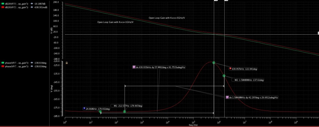 What happens when we increase the gain of the VCO? Increasing the gain of the VCO will only move the magnitude curve up. This means that the UGB point moves to the right. However the phase curve does not change at all as the zero and the poles are determined only by the passive components. (see figure below)