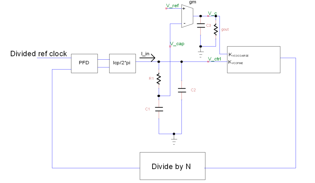 Note that the tradeoffs on the gain of the VCO and the maximum allowable swing on the output of the charge pump goes away. But wait a minute. Which means that V_c will have to move a lot or the gain in that path must be high enough to accommodate the frequency range that we were able to do using digital calibration. Yes, absolutely. The differential OTAs used to make the integrator have a near rail to rail range, and the VCO gain in that path can be made larger compared to the ‘fine’ path without much of a penalty. It will become clear as we proceed. But lets do some mathematics.
